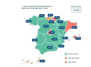 En el lado opuesto, Extremadura repite como la comunidad que cuenta con los alquileres más económicos. Con un precio medio de 341,35 euros mensuales (para un piso de 80m2) y un salario bruto promedio de 1.873,12 euros al mes, los extremeños tienen que destinar el 18,2 por ciento de su sueldo al pago de su vivienda de alquiler.