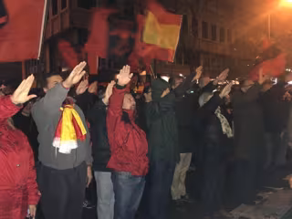 Tras más de una hora y media frente al edificio que albergó la casa de Primo de Rivera, los manifestantes han entonado el 'Cara al Sol' con el brazo en alto y algunos de ellos han iniciado una marcha nocturna con el objetivo de llegar al Valle de los Caídos, donde reposan los restos mortales del fundador de La Falange.