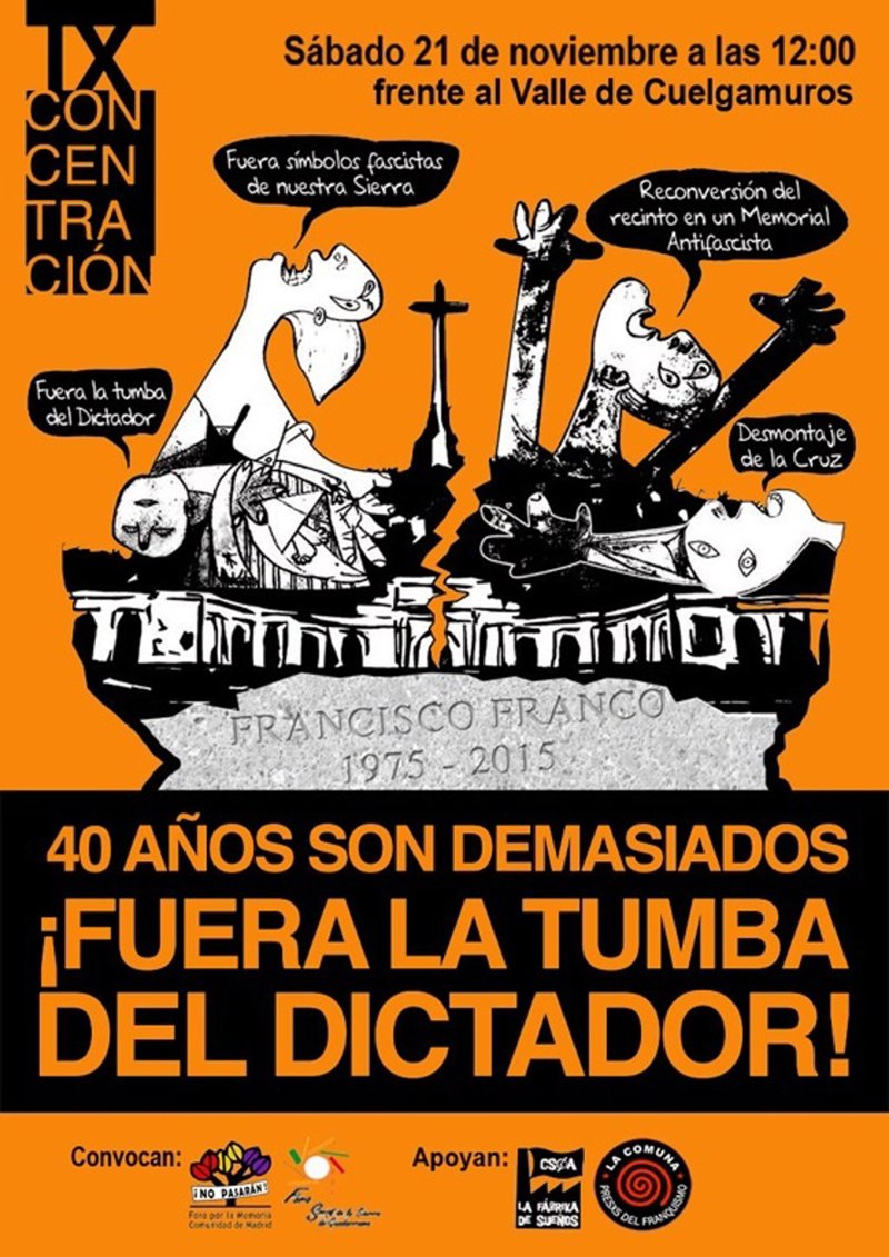 Concretamente, el Foro por la Memoria de la Comunidad de Madrid y el Foro Social de la Sierra ha convocado una concentración, comunicada a la Delegación del Gobierno, el sábado a las 12 horas en la entrada del recinto bajo el lema 'Fuera la tumba del dictador' y también en homenaje a los republicanos enterrados en el Valle de los Caídos. Piden también que se reconvierta el recinto en un memorial antifascista.