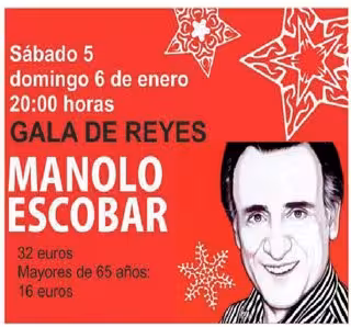 Escobar ofrecerá la Gala de Reyes 'Antología de la Copla', a las 20 horas "como una oportunidad de ver, en una de sus últimas actuaciones tras 50 años de carrera musical, a este cantante símbolo de la canción española y de la copla", según han asegurado desde el Ayuntamiento de la localidad.