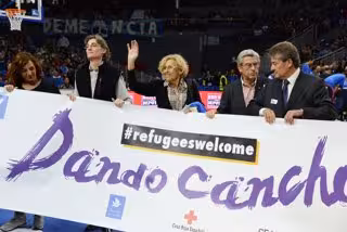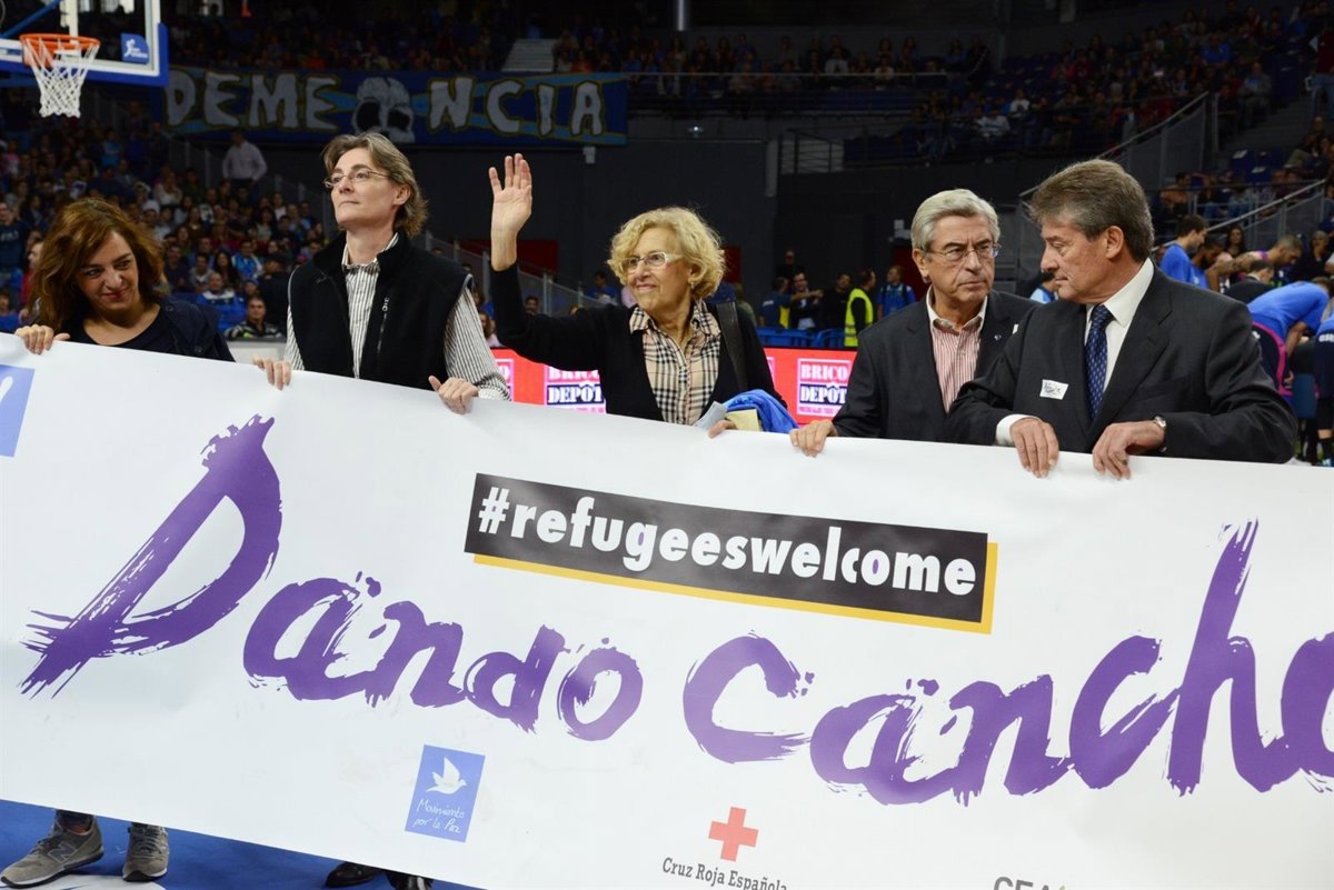 La alcaldesa de Madrid, Manuela Carmena, ha realizado hoy el saque de honor del partido de baloncesto disputado entre el Movistar Estudiantes y el Laboral Kutxa Baskonia en el Palacio de los Deportes, cuyos fondos se destinarán a los refugiados.