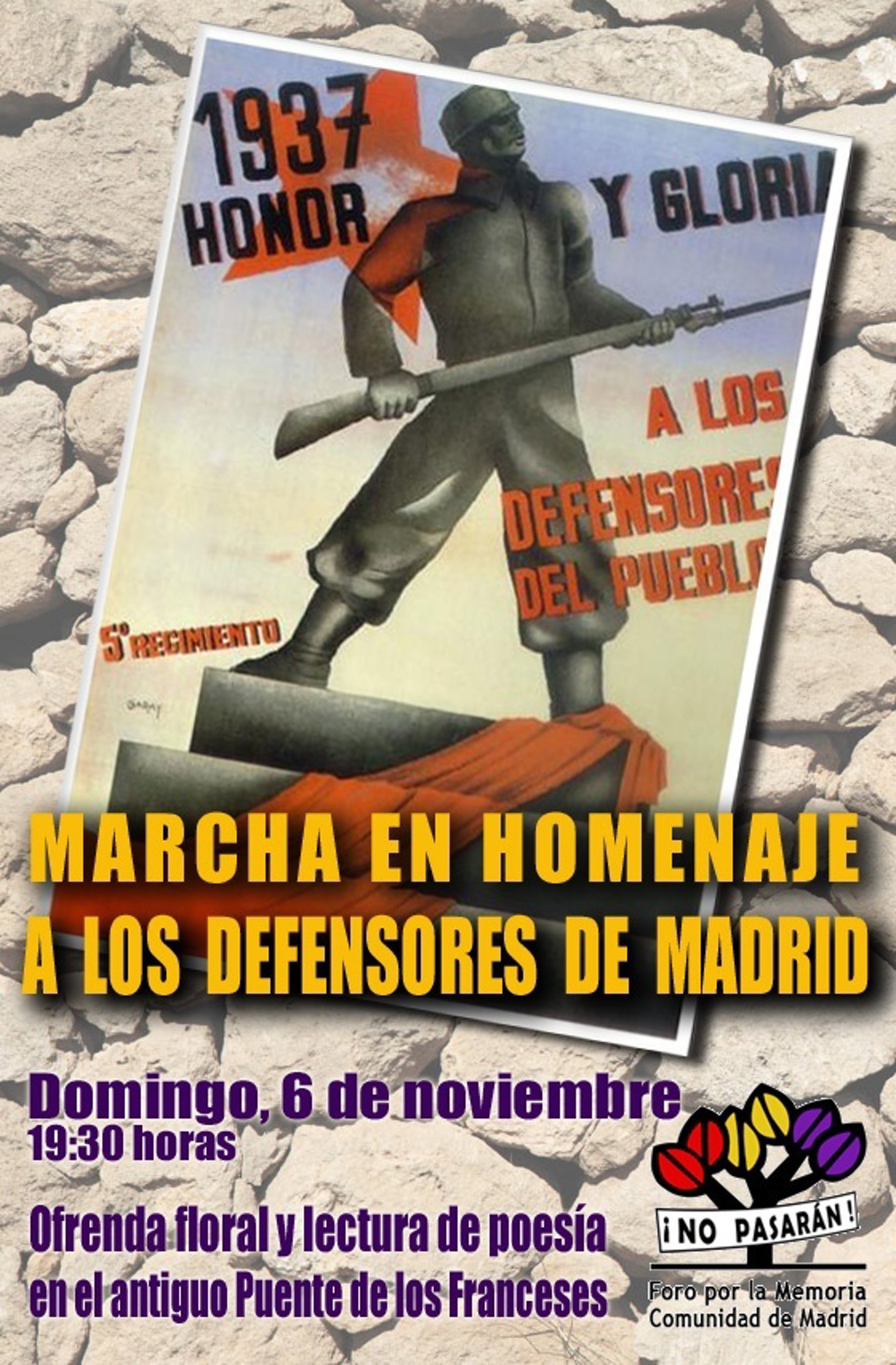 El Foro por la Memoria de la Comunidad de Madrid, la asociación Reconstrucción Comunista y la Organización Revolucionaria Antifascista han convocado una marcha para celebrar el 75 aniversario de la defensa de la ciudad de Madrid contra las tropas franquistas en la Guerra Civil Española.