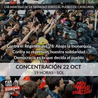 Las Marchas de la Dignidad, que organizaron por las masivas movilizaciones desde toda España a la capital para pedir 'Pan, Techo y Trabajo' para los más desfavorecidos, han convocado ahora esta concentración, que tendrá lugar hoy domingo a las 19 horas, contra "del cese de las persecuciones a las organizaciones políticas y sociales de Cataluña".