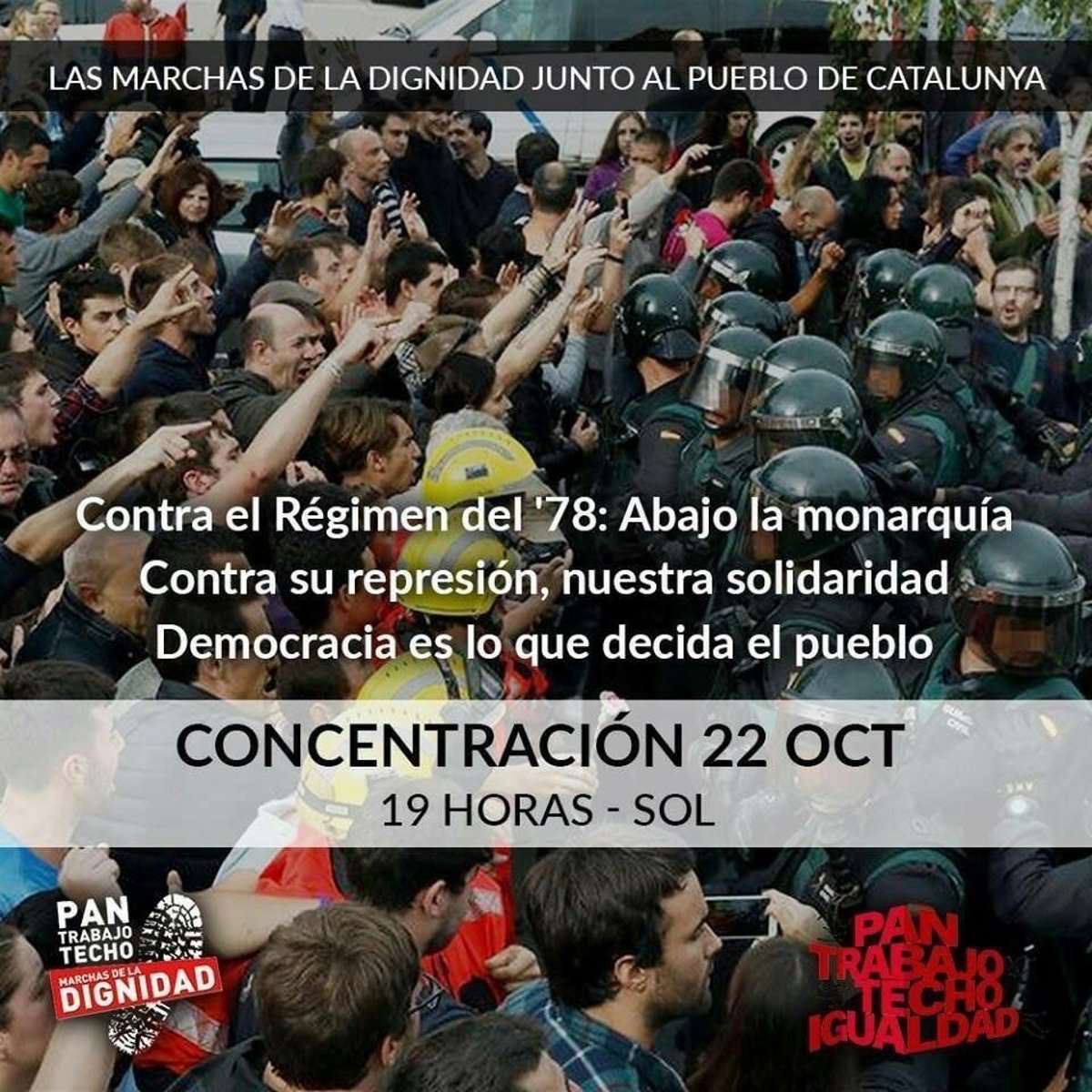 Las Marchas de la Dignidad, que organizaron por las masivas movilizaciones desde toda España a la capital para pedir 'Pan, Techo y Trabajo' para los más desfavorecidos, han convocado ahora esta concentración, que tendrá lugar este sábado a las 19 horas, contra "del cese de las persecuciones a las organizaciones políticas y sociales de Cataluña".