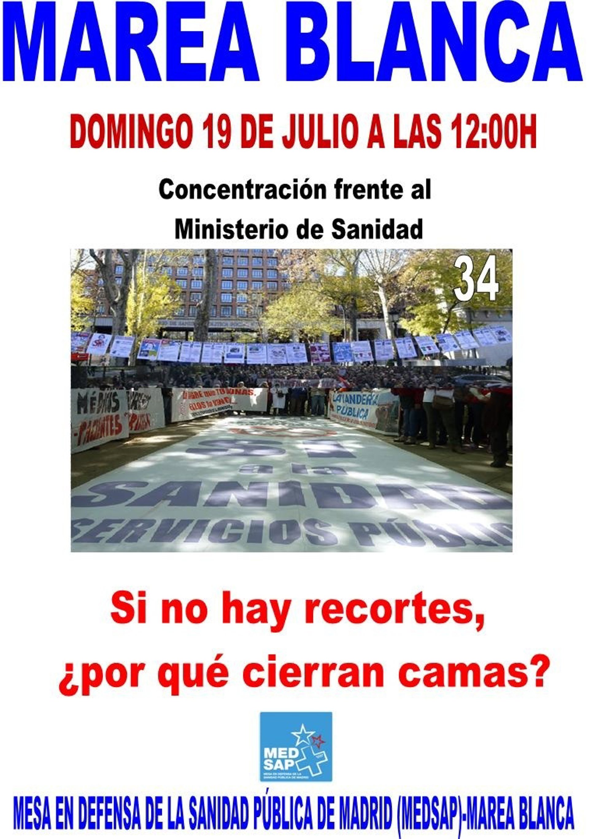 La Marea Blanca se concentrará este domingo a las 12.00 horas, frente al Ministerio de Sanidad, en su 34ª edición para expresar "su rotundo rechazo a las políticas de recortes sanitarios que parece que no van a ser corregidas por el nuevo Gobierno", según ha informado la Mesa en Defensa de la Sanidad Pública de Madrid (MEDSAP) en un comunicado.