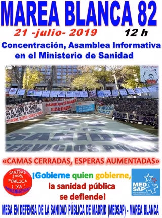La Mesa en Defensa de la Sanidad Pública de Madrid (MESDAP)- Marea Blanca se concentra este domingo a las 12 horas frente al Ministerio de Sanidad bajo el lema 'Camas cerradas, esperas aumentadas'.