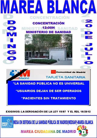 La Mesa en Defensa de la Sanidad Pública de Madrid (MEDSAP) ha convocado para este domingo una nueva 'Marea Blanca' para protestar contra el cese del doctor Marciano Sánchez Bayle por presidir la Asociación para la Defensa de la Sanidad Pública, y la "descapitalización aumentativa de la Sanidad Pública" madrileña.