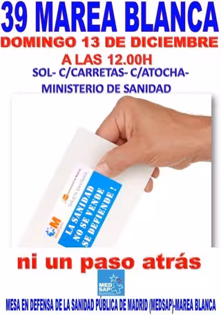 La Marea Blanca volverá a salir a las calles este domingo en su 39ª edición para preguntar a los candidatos de los distintos partidos a las elecciones generales del 20 de diciembre si van a "recuperar la Sanidad Pública", según ha indicado la Mesa en Defensa de la Sanidad Pública (MEDSAP) en un comunicado.