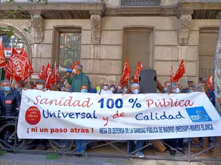 Bajo el lema 'Mientras liquida Nuestra Salud, Ayuso arrolla con su Ley Ómnibus', la Mesa en Defensa de la Sanidad Pública de Madrid (MEDSAP)-Marea Blanca ha convocado un acto de protesta a partir de las 12 horas que irá desde el Ministerio de Sanidad, en el Paseo del Prado, hasta la Puerta del Sol.