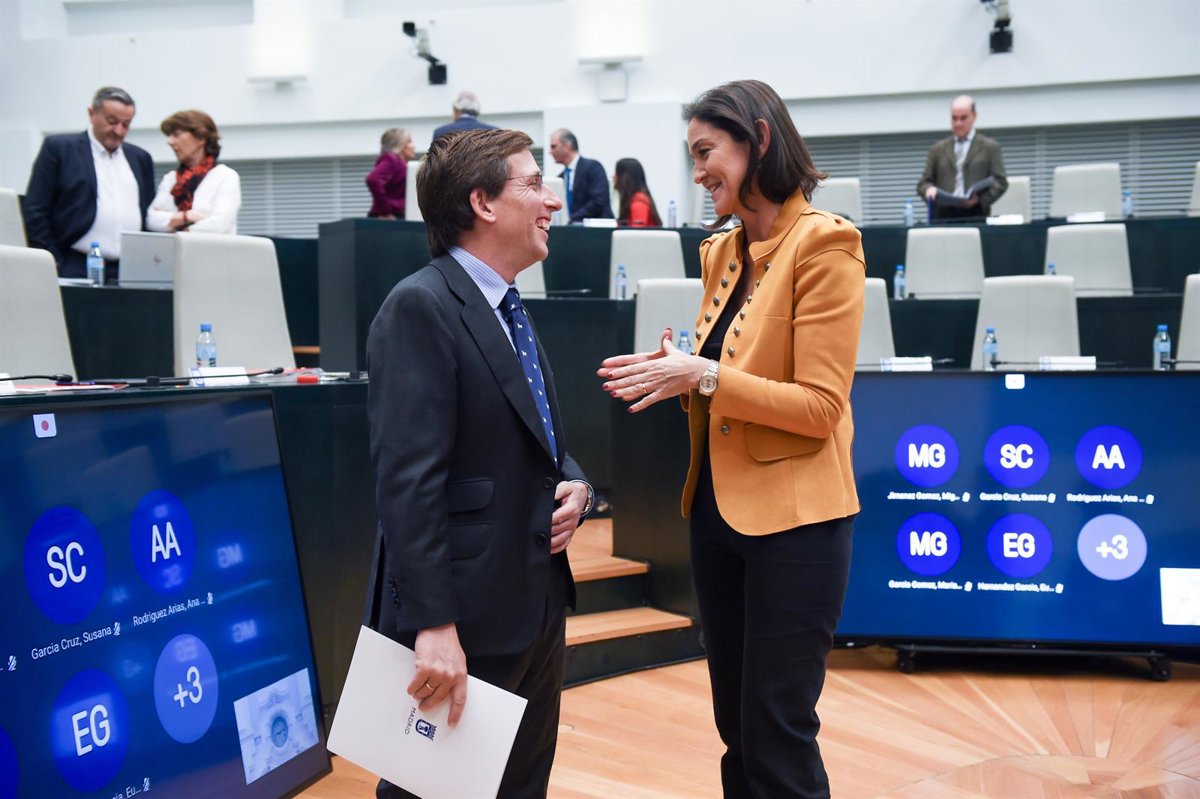 El alcalde de Madrid, José Luis Martínez Almeida, y la portavoz municipal del grupo Socialista en el Ayuntamiento de Madrid, Reyes Maroto, durante una sesión ordinaria del pleno municipal, en el Palacio de Cibeles, a 28 de enero de 2025, en Madrid (España - Gustavo Valiente - Europa Press