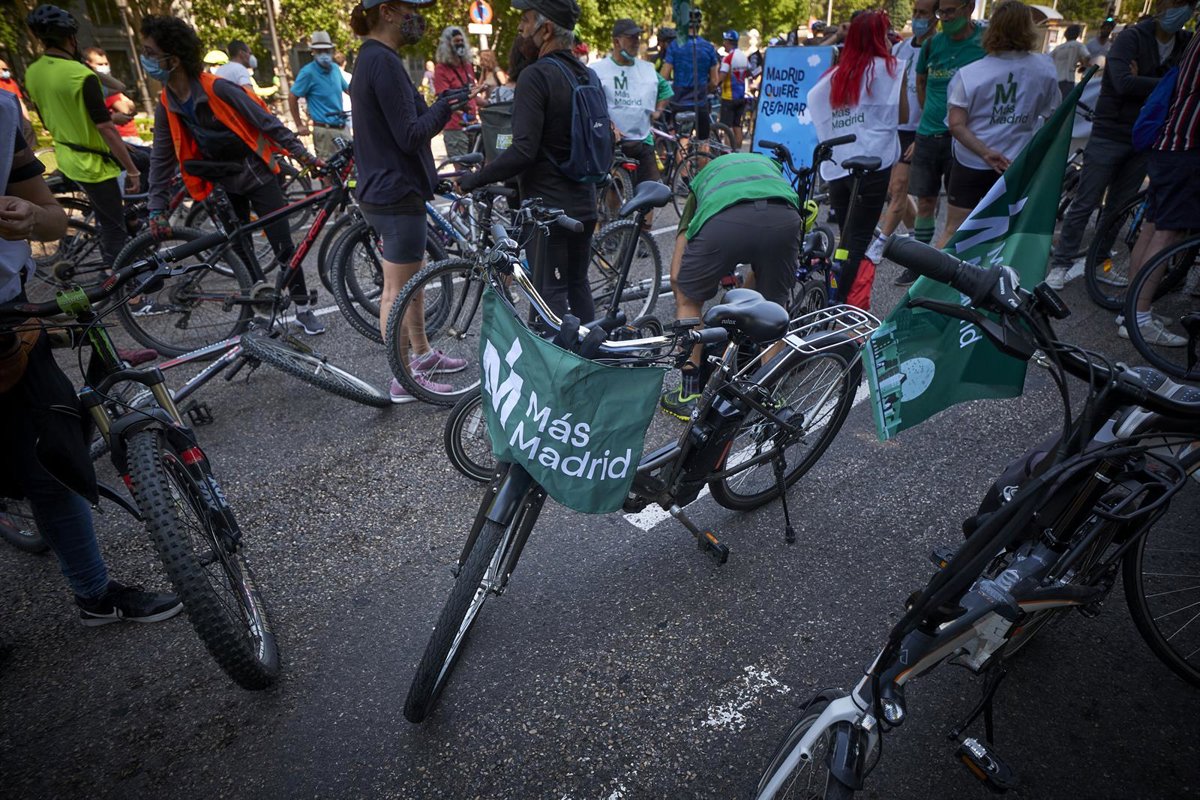 Archivo - Una bicicleta porta banderas del partido Más Madrid. - Jesús Hellín - Europa Press - Archivo
