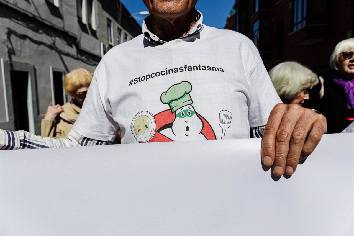 Varias personas de agrupaciones vecinales protestan contra las Cocinas Fantasma, frente a una de ellas en el distrito de Tetuán, a 12 de marzo de 2023, en Madrid (España). Estos negocios tienen interpuestas demandas exigiendo el cierre de todas las coci - Carlos Luján - Europa Press