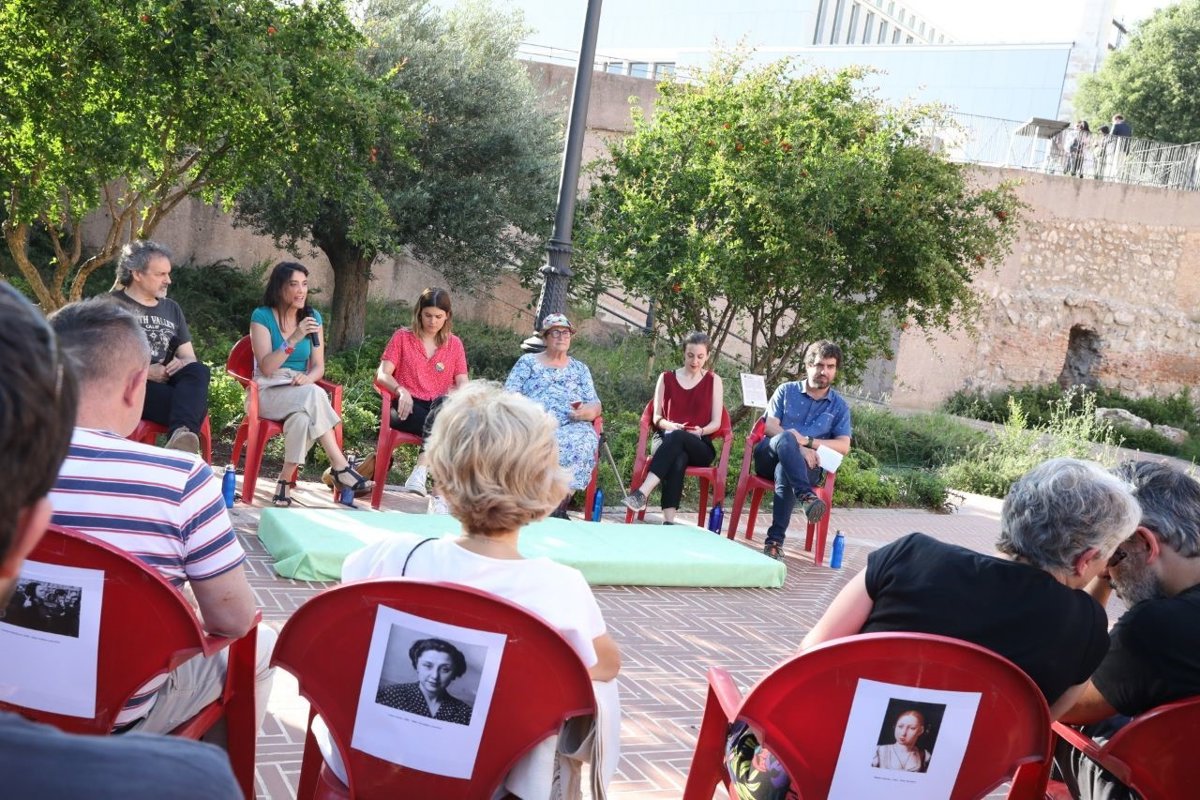 Su compañera Manuela Bergerot ha tomado la palabra desde el parque Emir Mohamed --salpicado con sillas en cuyo respaldo se rendía homenaje a mujeres históricas, como Clara Campoamor, La Pasionaria, Gerda Taro, 'Colombine'...-- para reivindicar la memoria feminista porque sólo el 7 por ciento de los referentes culturales y científicos de los libros de texto de la ESO son mujeres cuando ellas representan la mitad de la sociedad.