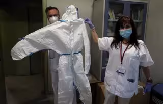 Dos sanitarios del Centro de Salud García Noblejas muestran uno de los trajes de protección frente al Covid-19 - Eduardo Parra - Europa Press