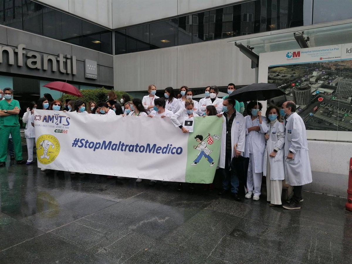 La protesta, que cuenta con el apoyo del sindicato médico Amyts, ha coincidido con la visita al citado centro hospitalario del consejero de Sanidad de la Comunidad de Madrid, Enrique Ruiz Escudero, para inaugurar la nueva Unidad de Cuidados Intensivos Neonatales del Hospital público La Paz.