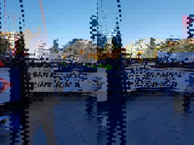 La protesta ha sido secundada entre pitidos al Gobierno, lemas como 'Almeida mentiroso' o 'El PP quiere privatizar la EMT', con villancico incluido.