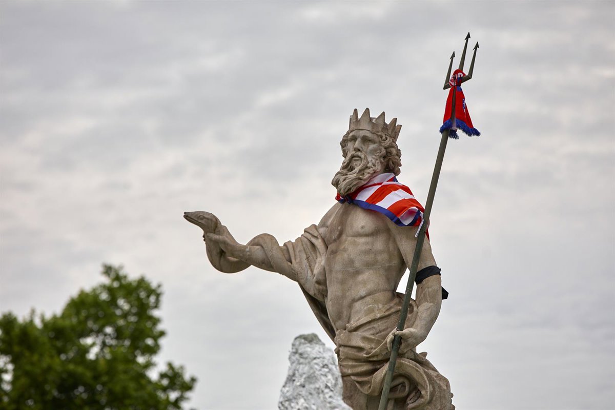 Archivo - La estatua de la fuente de Neptuno, con una bufanda del Atlético de Madrid. - Jesús Hellín - Europa Press - Archivo