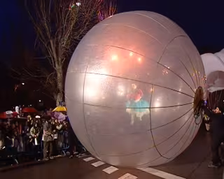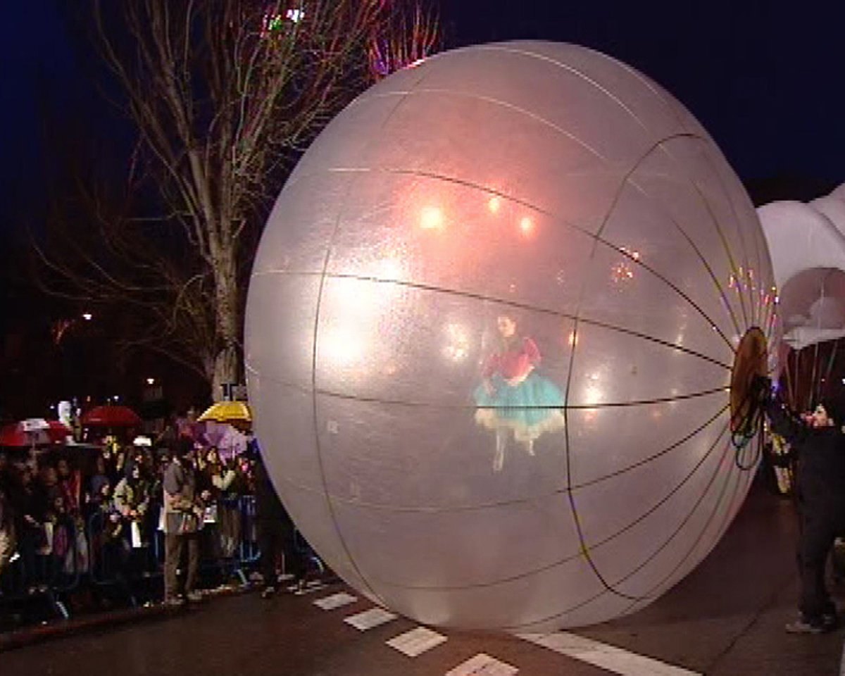 La comitiva ha sido abierta por dos esferas de 6 y 9 metros de diámetro respectivamente, que han rodado por la calle gracias a dos bailarinas que irán en su interior. Por encima de ellas han volado tres gaviotas de diez metros de envergadura que representarán la importancia de perseguir los sueños de la infancia y no dejarlos escapar.
