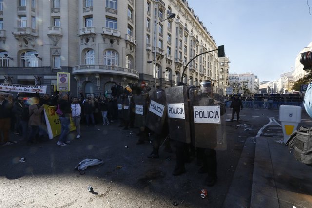 Uno de los momentos de tensión de la marcha se ha producido cuando agentes de la Unidad de Intervención Policial (antidisturbios) han cargado contra un grupo de taxistas que intentaban derribar las vallas instaladas en las cercanías de la Plaza de las Cortes.