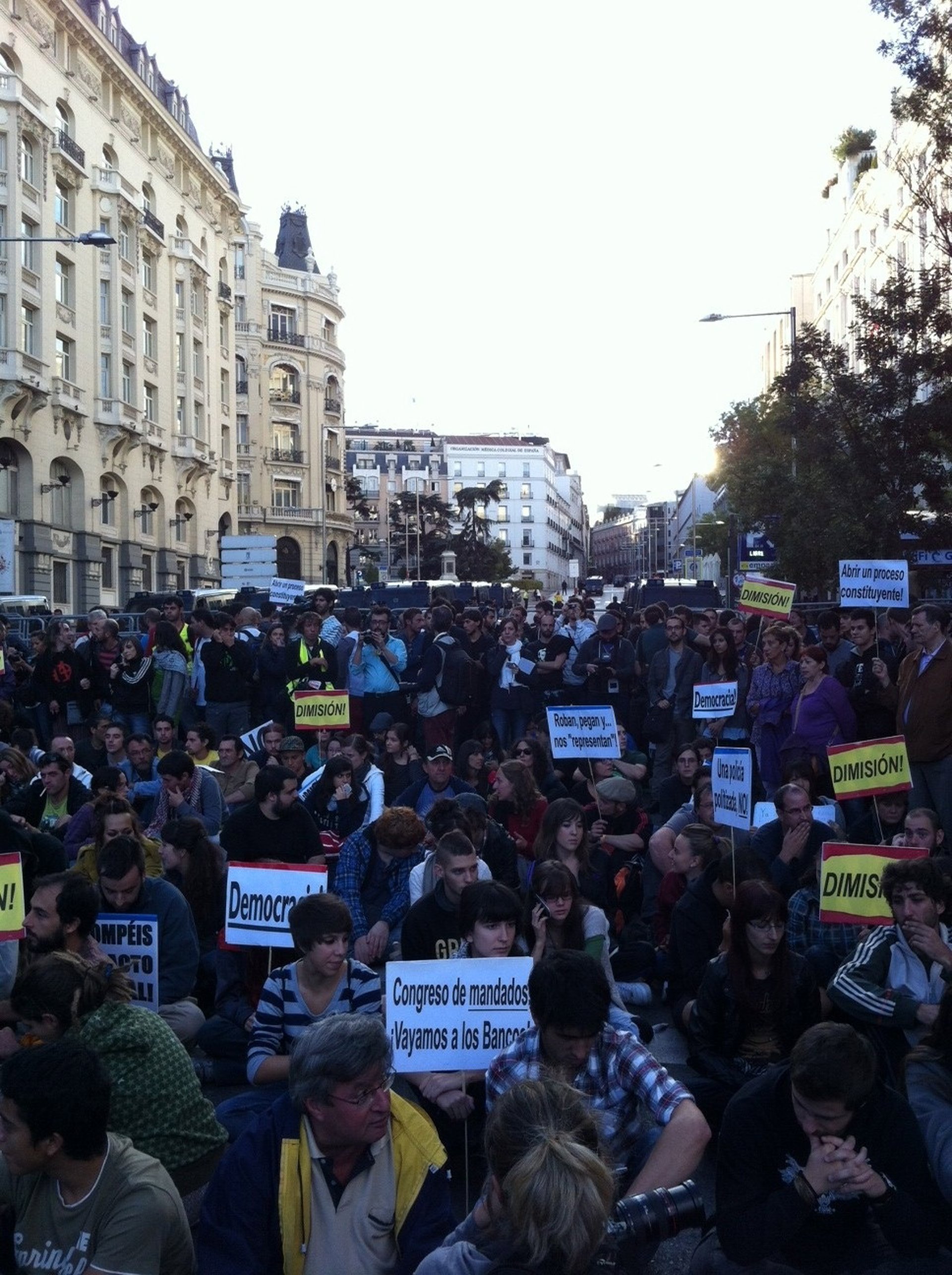 Hasta ese momento, los manifestantes estaban separados en dos grupos, uno junto a la fuente de Neptuno y otro en la acera del Museo del Thyssen y el inicio de la Carrera de San Jerónimo, custodiados ambos por sendos cordones policiales con objeto de dejar libre el paso del tráfico en el lateral del Paseo del Prado, a la altura de la plaza Cánovas del Castillo.