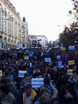Algunos de estos 'indignados', seguidos por una nube de fotógrafos y periodistas, se han encarado con los policías al grito de "no tenemos miedo", "fuera, fuera". Éstos han respondido reculando, al tiempo que daban algún porrazo aislado a los manifestantes que más se aproximaban a ellos con tono reivindicativo.