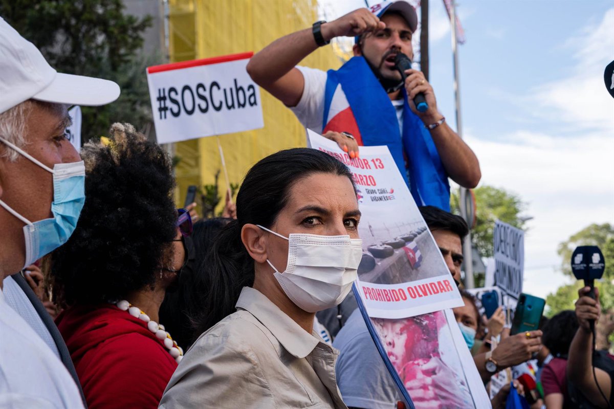 "Esa Ley debería haber sido un estado de excepción y nos encerraron a todos los españoles como el buen dictador que es", ha lanzado Monasterio en referencia al presidente del Gobierno, Pedro Sánchez, durante una concentración frente a la embajada de Cuba en Madrid.