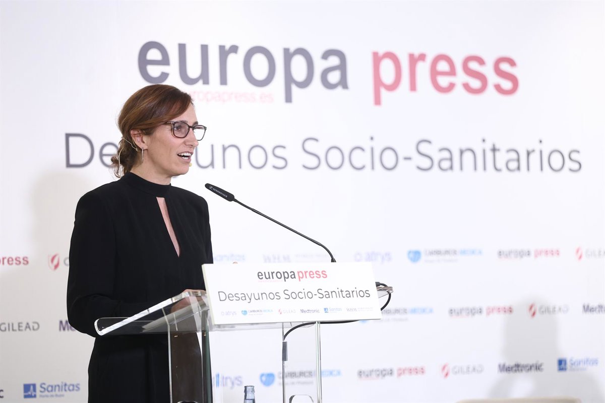 La ministra de Sanidad Mónica García, interviene durante un Desayuno Socio-Sanitario organizado por Europa Press, en el Hotel Hyatt Regency Hesperia Madrid, a 22 de septiembre de 2025, en Madrid (España). - Eduardo Parra - Europa Press