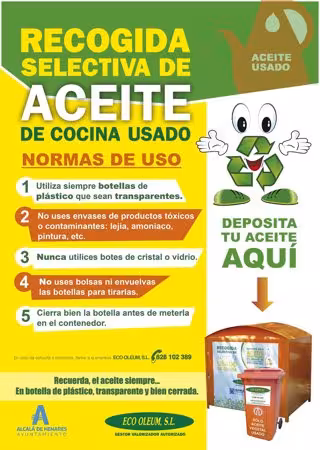 Alcalá de Henares cuenta con 66 contenedores de recogida de aceite vegetal distribuidos en todos los distritos gracias al Servicio de Recogida de Aceite Vegetal Usado de Origen Domiciliario instalado desde el año 2009, además del Punto Limpio Municipal, ha informado el Ayuntamiento de Madrid en un comunicado.