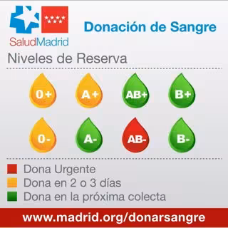 Además, también se requiere donación de los tipos sanguíneos '0+', 'A+' y '0-', dado que se encuentran en nivel amarillo. El resto de tipos presentan niveles óptimos.