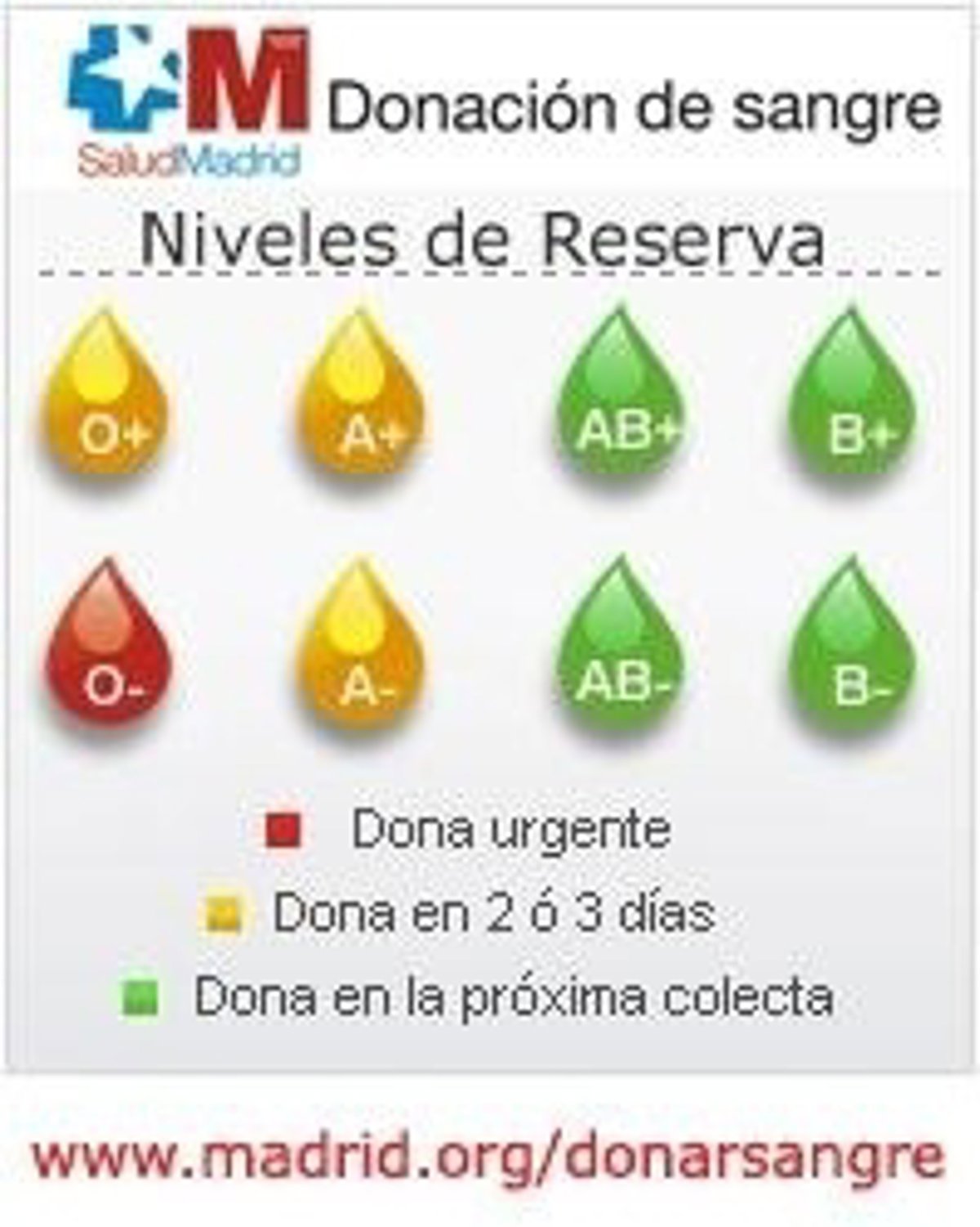 Por otro lado, se ha fijado nivel verde para los tipos AB+, AB-, B+ y B-, de forma que las personas con estos grupos sanguíneo pueden donar en la próxima colecta.