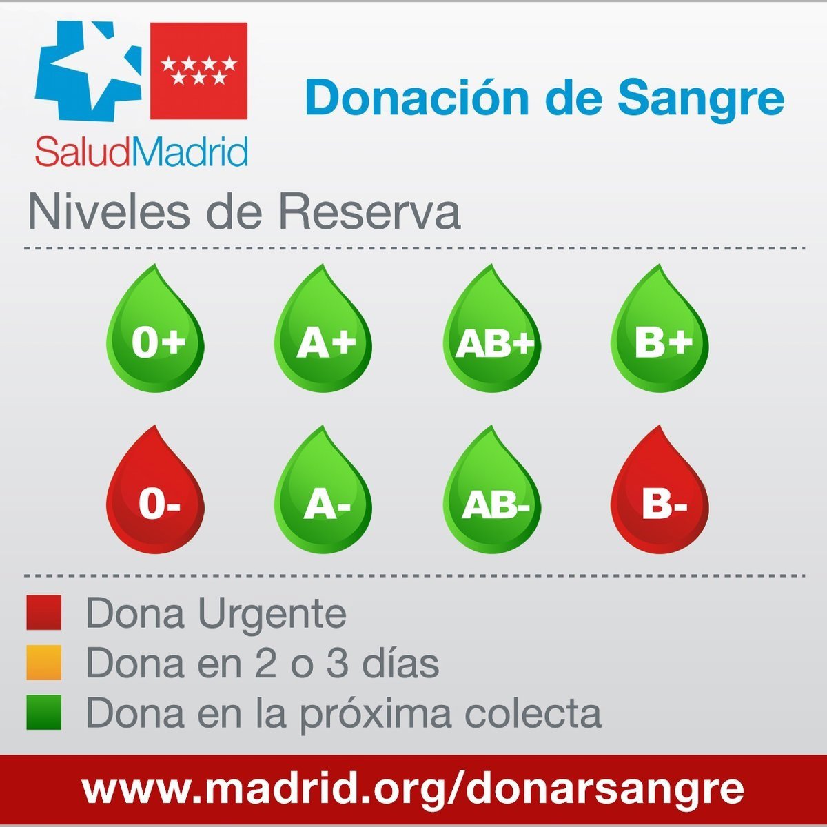 El Centro de Transfusión de Sangre de la Comunidad de Madrid ha requerido este martes donaciones de tipo sanguíneo 'B-' y '0-' de manera urgente, ya que las reservas se encuentran en alerta roja, mientras que el resto presenta niveles óptimos.