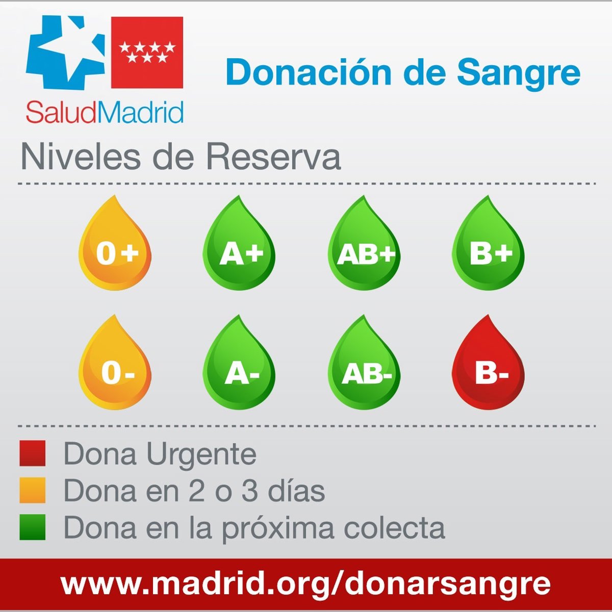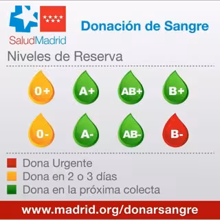El 'B-' sin embargo, baja de nuevo y continúa en alerta roja. Quedan muy pocas unidades de este grupo. El Centro de Transfusión pide de manera especial al 2 por ciento de los madrileños que tiene este grupo que acudan a donar a su punto más cercano.