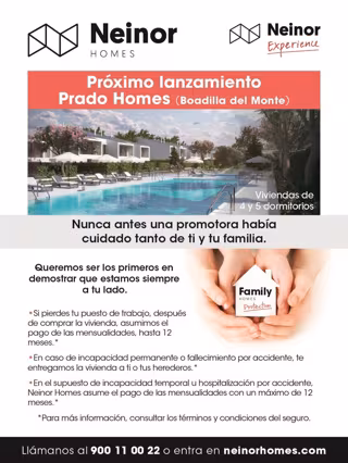 Unido al lanzamiento de esta promoción de viviendas, y con la colaboración de la aseguradora CNP Partners, se ofrece el seguro Family Homes Protection, destinado a proteger y cuidar de las familias que han decidido confiar en la compañía promotora y escoger un hogar en Prado Homes, con el sello de calidad Neinor Homes.