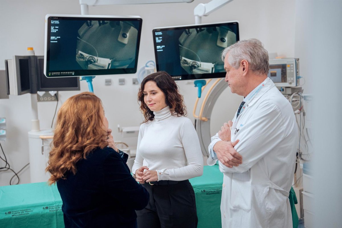 La presidenta de la Comunidad de Madrid, Isabel Díaz Ayuso, y el jefe del servicio de endoscopia digestiva, José Luis Calleja, durante la visita a la nueva Unidad de Endoscopia de Digestivo del Hospital público Universitario Puerta de Hierro Majadahonda - Gabriel Luengas - Europa Press