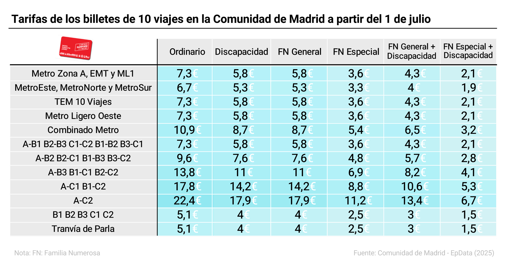 Por su parte, los abonos de 10 viajes de Metro, autobuses de la EMT, ML1, Metro Ligero Oeste y TFM (Transportes Ferroviarios de Madrid) pasarán a costar 7,30 euros, con una bonificación del 40%. Por su lado, MetroEste, MetroNorte y MetroSur costará 6,70 euros y el combinado de Metro, válido para Metro de Madrid, TFM, Metros Ligeros de Madrid y Metro Ligero, será de 10,90 euros.