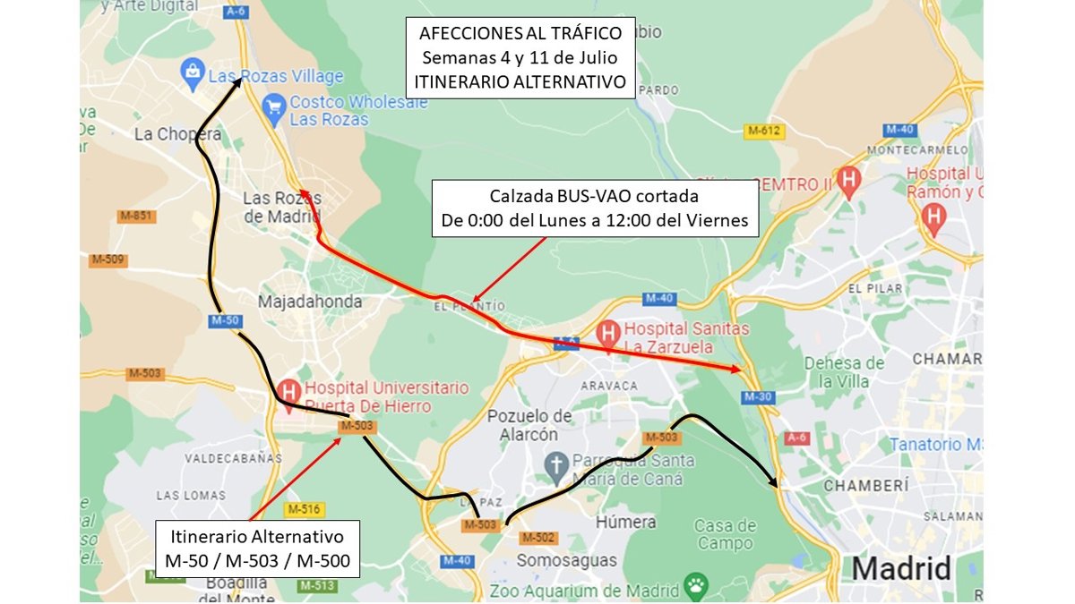Como itinerario alternativo para evitar las obras, se aconseja la M-40 hasta la salida 46 para tomar la autovía A-6 sentido A Coruña o la M-30 en salida 20 B para tomar la autovía M-500 (carretera de Castilla) / M-503 y M-40 hasta la salida 46 para tomar la autovía A-6 sentido A Coruña.
