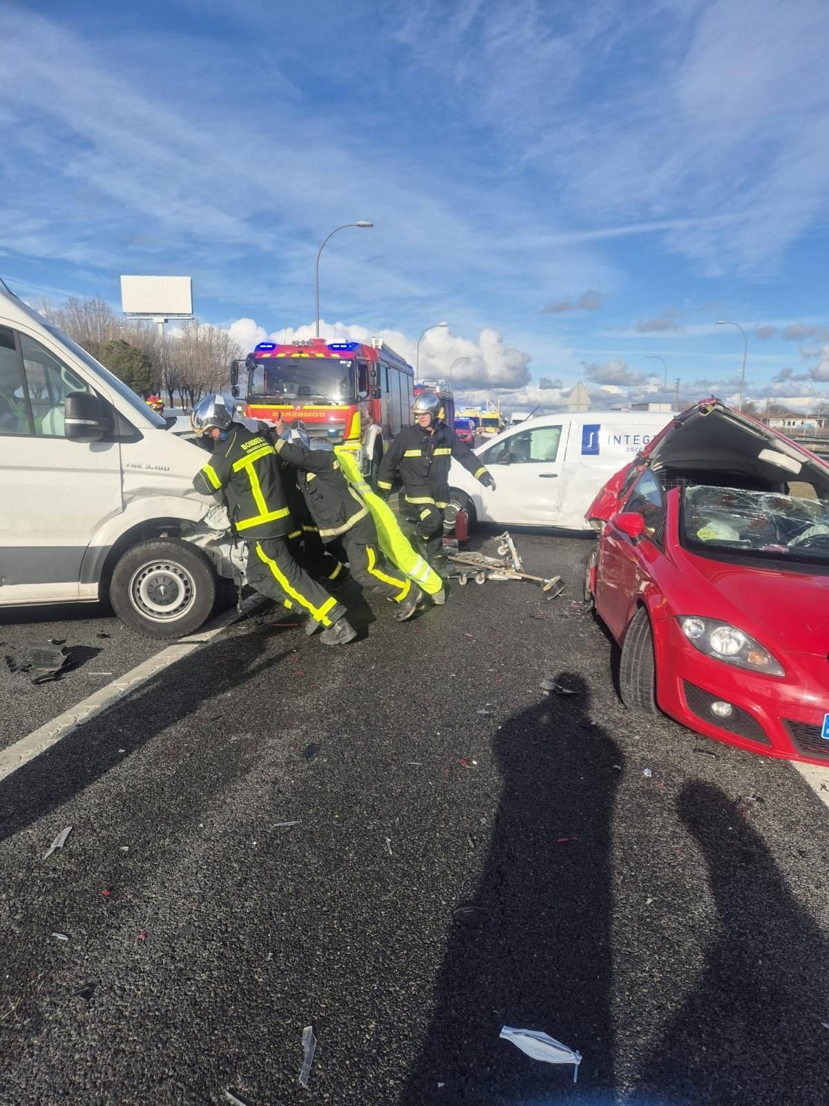 Al lugar han acudido efectivos de los Bomberos de la Comunidad de Madrid, que han excarcelado a la conductora de uno de los turismos implicados y que había quedado atrapada en el interior de su vehículo.