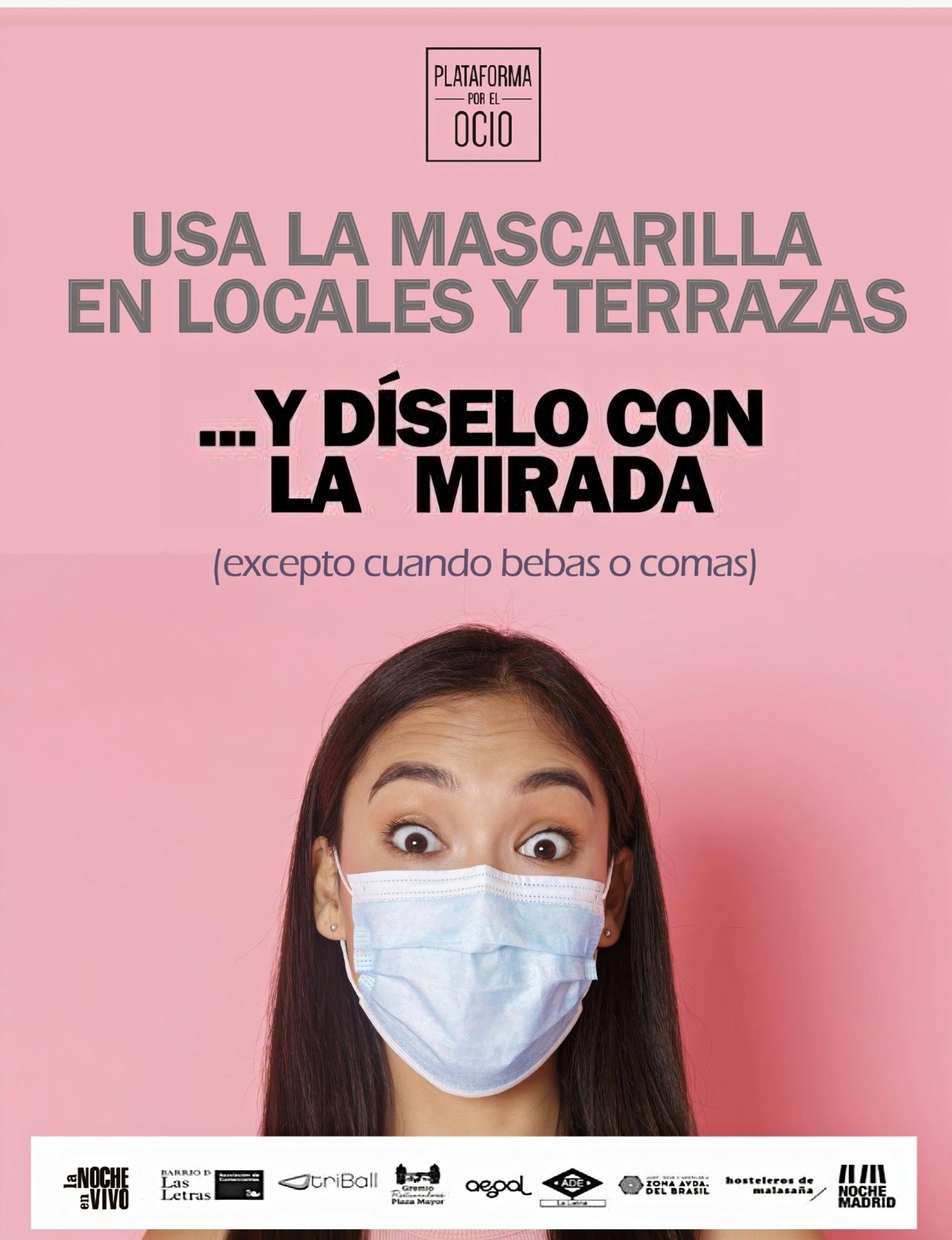 La Plataforma por el Ocio ha lanzado la campaña 'Díselo con la mirada' para recordar la importancia y necesidad del uso obligatorio de la mascarilla en bares, restaurantes, pubs y discotecas de la Comunidad de Madrid.