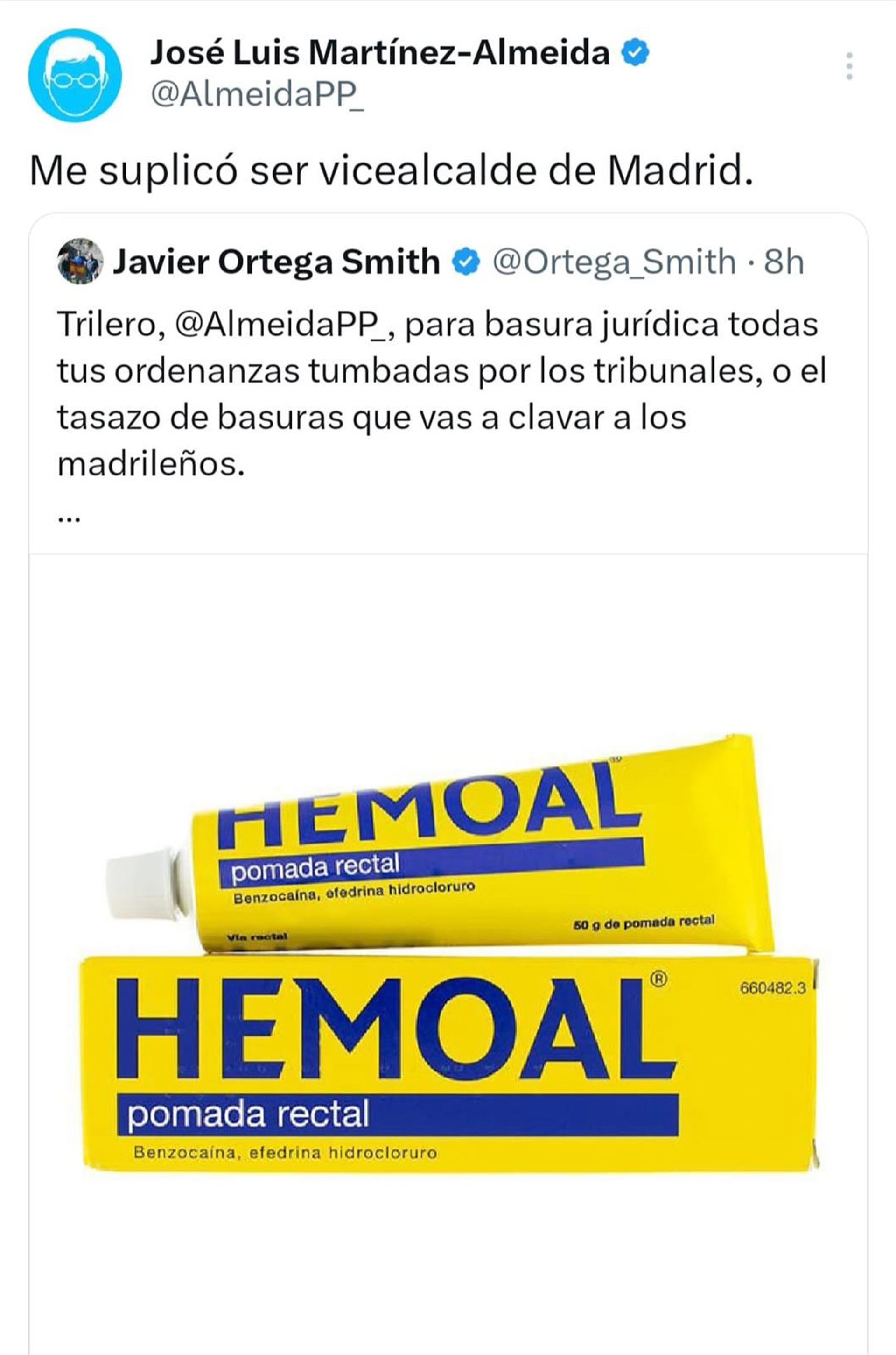 Pero Ortega Smith no había terminado su mensaje. Lo ha hecho con la frase "y recuerda, si te escuece...", para pasar a adjuntar una imagen del medicamento 'Hemoal, pomada rectal'. Solo unos minutos ha tardado en responder el alcalde, también vía 'X', con una frase: "Me suplicó ser vicealcalde de Madrid".