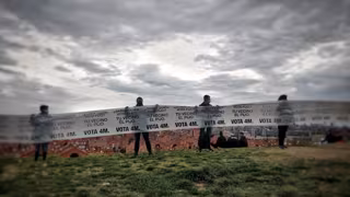 Una pancarta de un kilómetro en el vallecano 'Parque de las Tetas' alerta de que "quien vota fijo es tu vecino el pijo". Es la última acción de los activistas del movimiento #Defiéndete 4M, que busca la movilización del voto progresista en las elecciones a la Comunidad de Madrid.