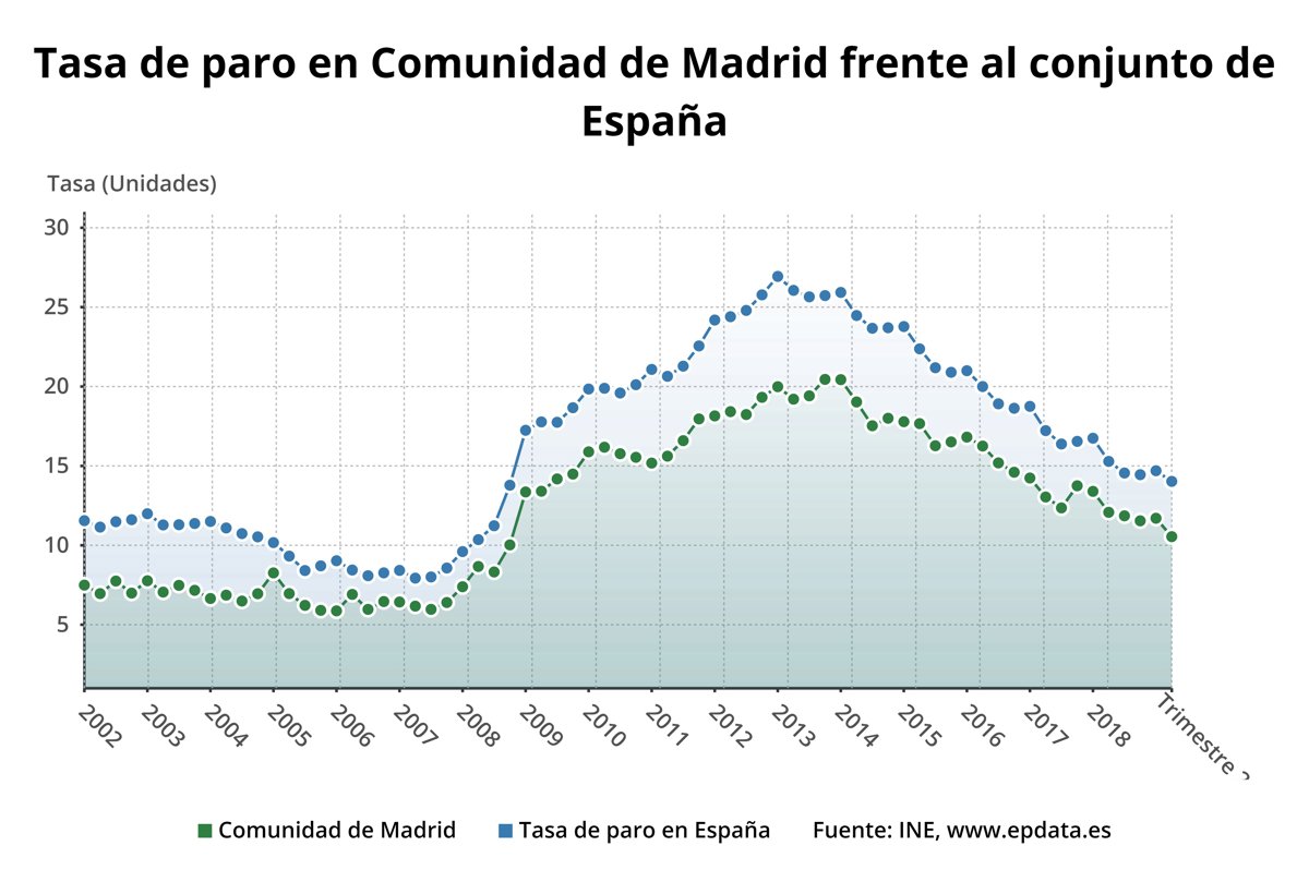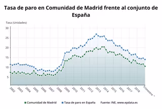 Según la EPA, la tasa de desempleo en la Comunidad de Madrid fue del 10,54 por ciento en el segundo trimestre del 2019. Del total de desempleados en la región, 173.000 eran hombres, siendo la tasa de desempleo en el género masculino del 9,8 por ciento; mientras que 191.600 parados eran mujeres, con una tasa de desempleo de 11,32 por ciento.