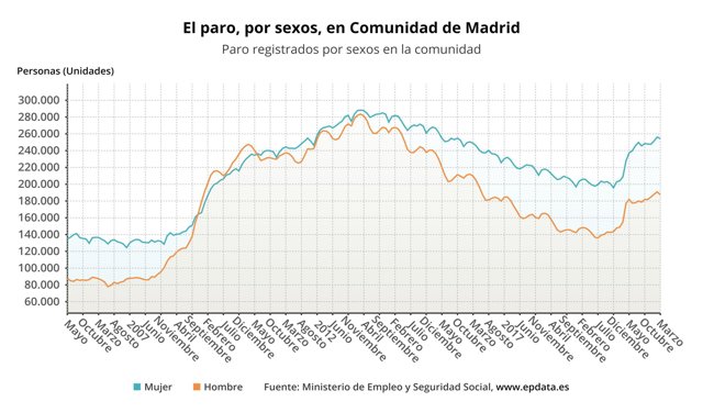 De la cifra total de desempleados en la Comunidad de Madrid, que suman 441.630 personas en paro, 187.414 son hombres y 254.216 son mujeres. Además, 39.220 desempleados de la región tienen menos de 25 años, de los cuales 20.318 son hombres y 18.902 son mujeres.