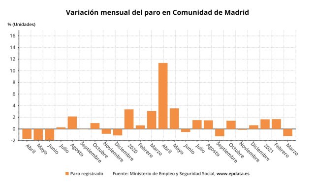 El número de parados registrados en las oficinas de los servicios públicos de empleo (antiguo Inem) en la Comunidad de Madrid cayó un 1,22% en marzo con 5.471 desempleados menos en relación al mes de febrero, hasta alcanzar la cifra global de 441.630 personas en paro en la región.