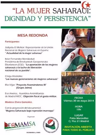 El Patio Maravillas acogerá este viernes, 30 de mayo, a las 19 horas, una mesa redonda bajo el título 'La mujer saharaui: dignidad y persistencia', un acto dedicado a la "lucha de las mujeres saharauis por la libertad de su pueblo y su resistencia frente a la invasión marroquí".