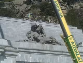 Los técnicos de Restauración de Patrimonio Nacional iniciaron esta mañana las labores de desmontaje de la escultura de La Piedad, situada en lo alto de la Basílica Santa Cruz del Valle de los Caídos, para evitar colocar una reproducción en el lugar con motivo del importante desgaste sufrido en los últimos años por el estrés térmico al que está sometida.