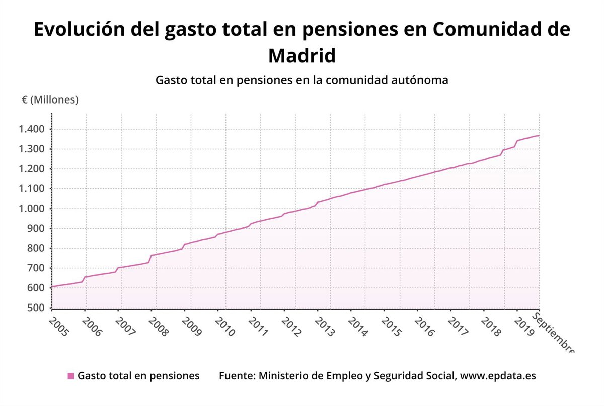 Gráfico de la evolución del gasto en pensiones en la Comunidad de Madrid a octubre de 2019. - EPDATA