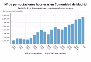 La Comunidad de Madrid registró más de 2,3 millones de pernoctaciones hoteleras en junio, lo que supone un incremento del 6,1 por ciento con respecto al mismo periodo del año anterior.
