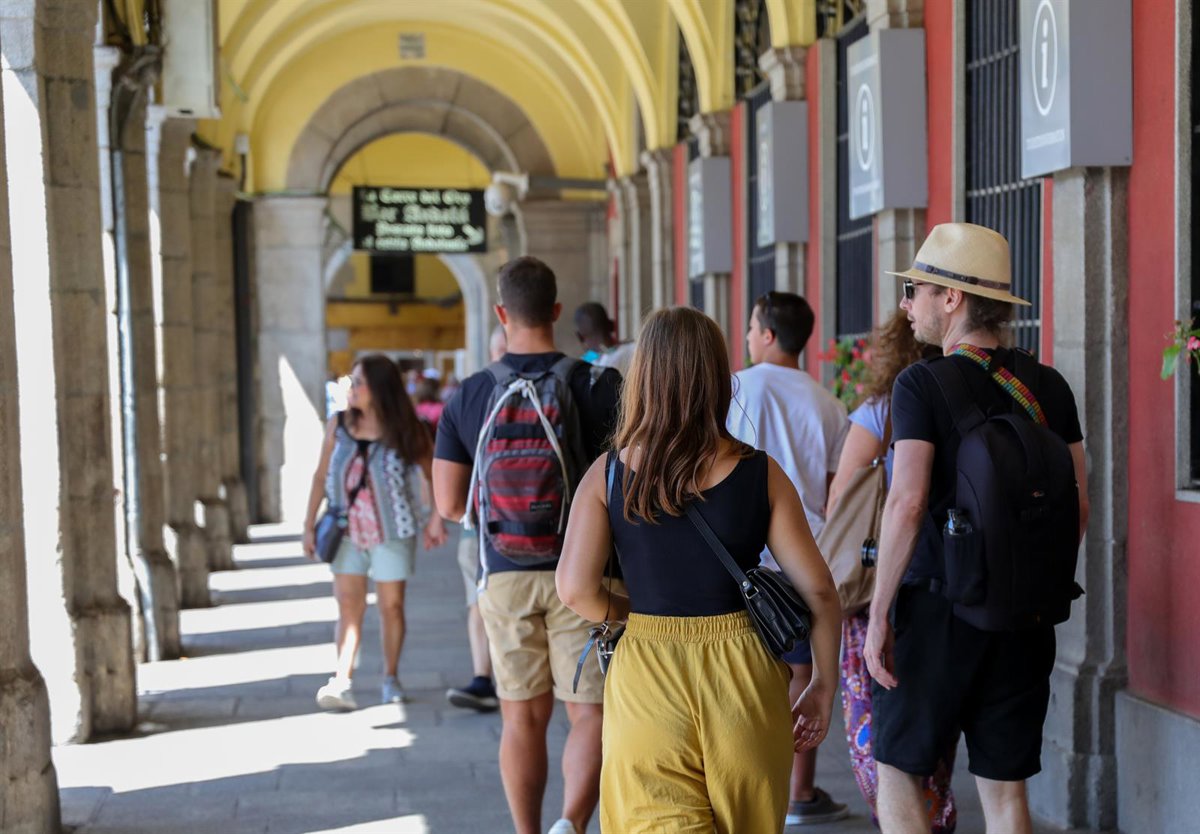 Archivo - Varios turistas pasean en la Plaza Mayor de Madrid. - Jesús Hellín - Europa Press - Archivo