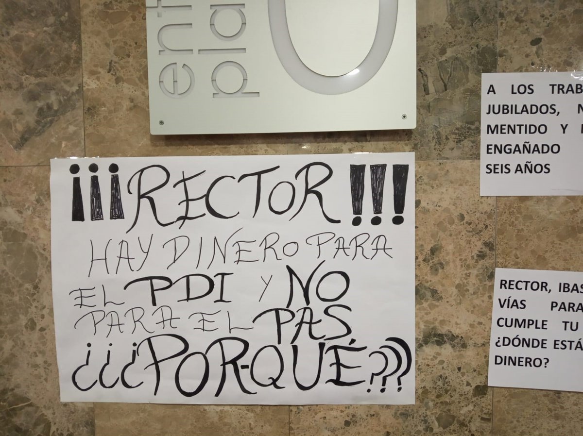 Durante la acción reivindicativa, se han pegado a las papeles diversos carteles con lemas como '¡¡¡Rector!!! Hay dinero para el PDI pero no para el PAS ¿¿¿Por qué???', 'A los trabajadores jubilados nos han mentido y nos han engañado durante seis años' o 'Rector, cumple tu palabra ¿dónde está nuestro dinero?'.