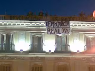 Varias personas han subido minutos antes de las 21.30 horas al edificio de la emblemática pastelería 'La Mallorquina' de la Puerta del Sol y han desplegado un cartel de varios metros de largo donde se leía "Democracia Real Ya".